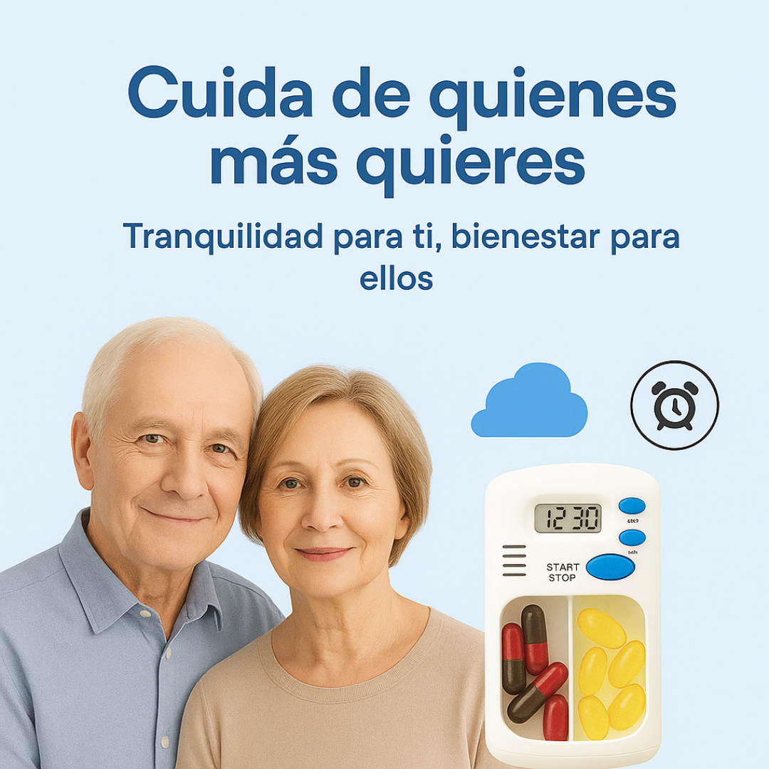 Para quienes quieren cuidar sin tanta preocupación. Sus alertas evitan olvidos, su tamaño acompaña a cualquier parte y su uso sencillo da seguridad. Mantén la medicación al día, incluso cuando no estás.